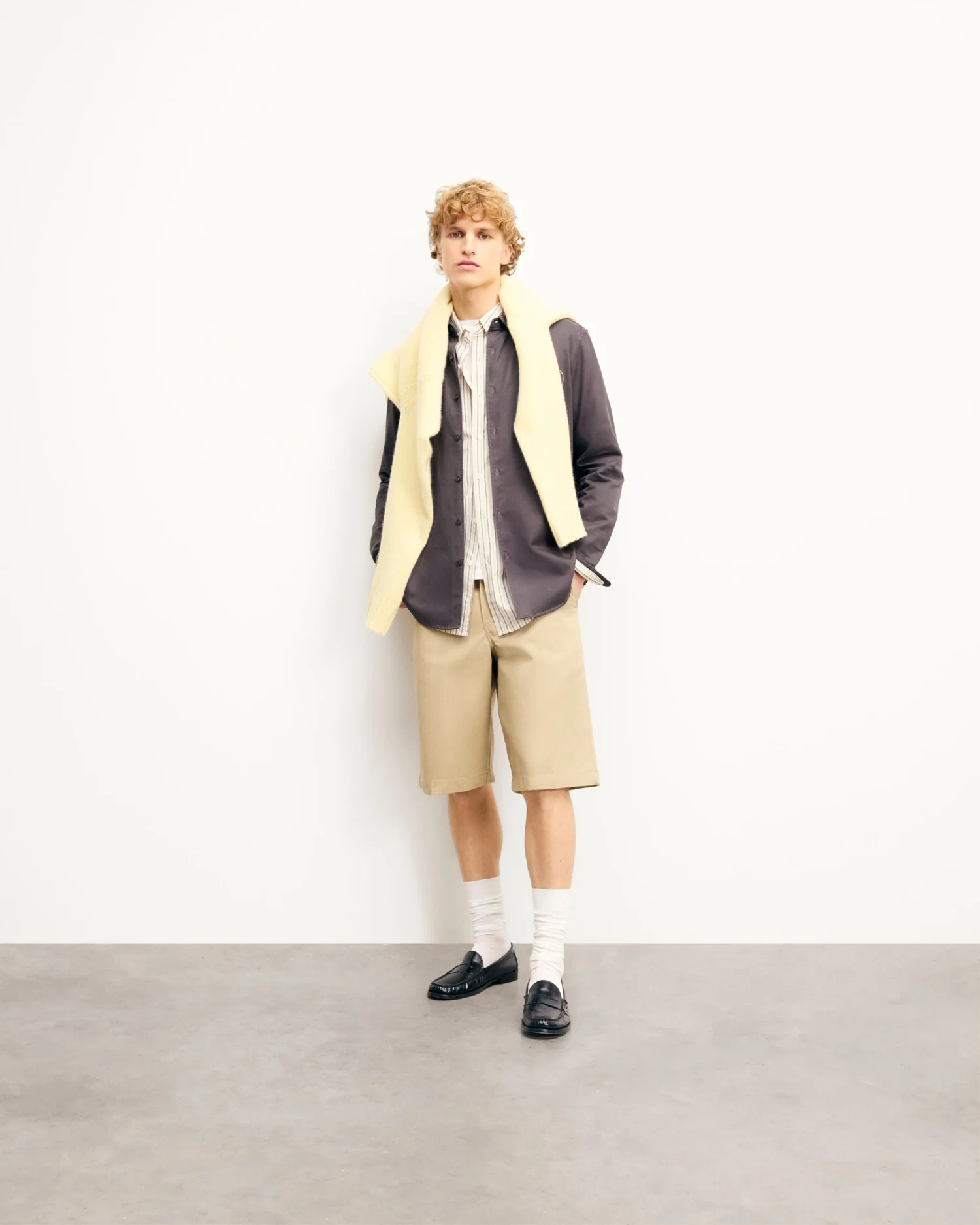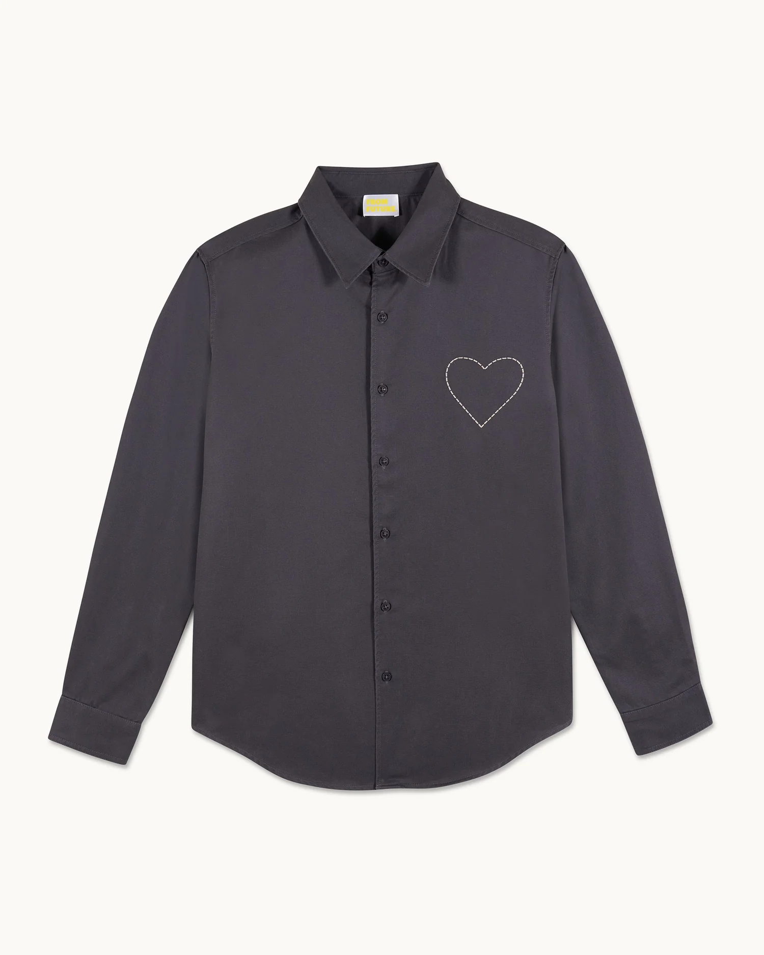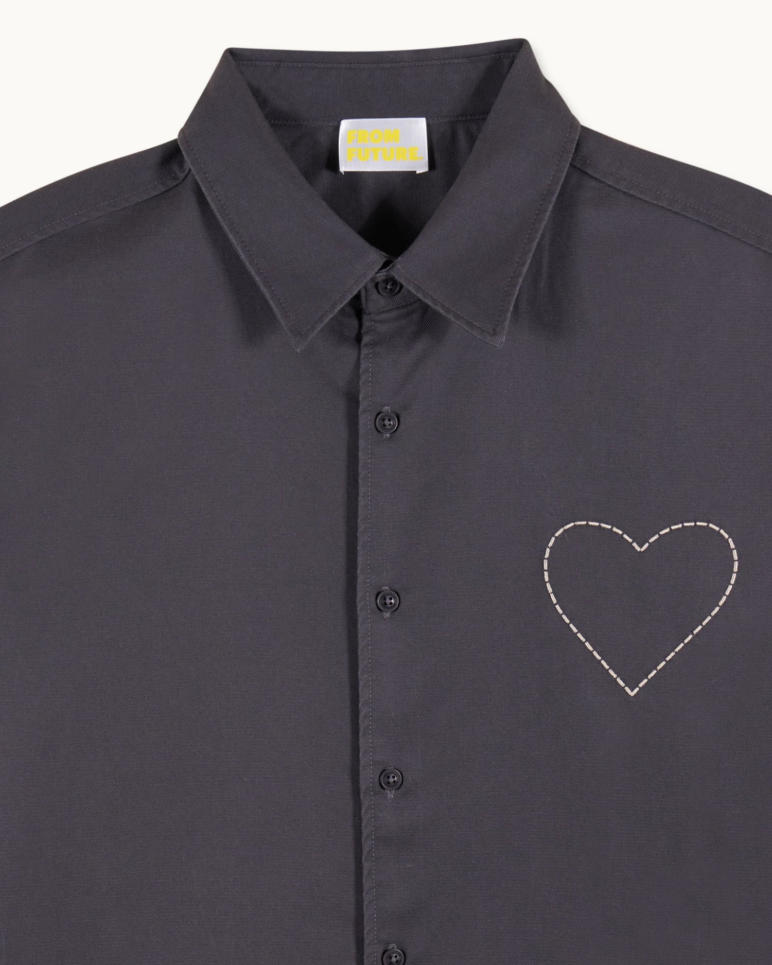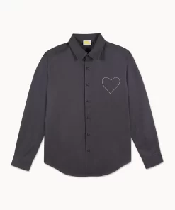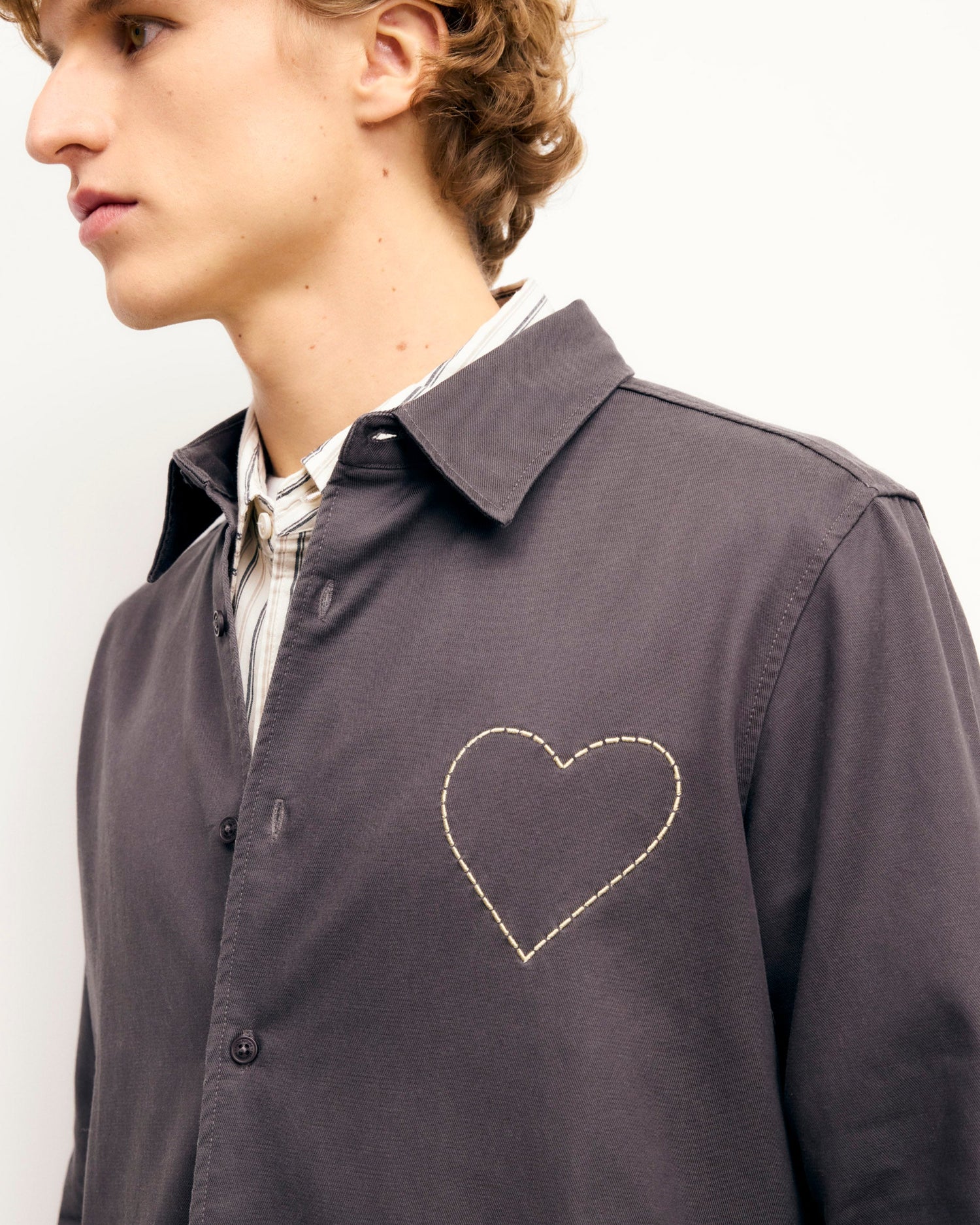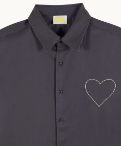 Cette chemise structurée dévoile un cœur délicatement brodé et surpiqué sur la poitrine. Munie d’un col chemise et de manches longues, elle dévoile une fermeture et des poignets boutonnés pour une silhouette sophistiquée.