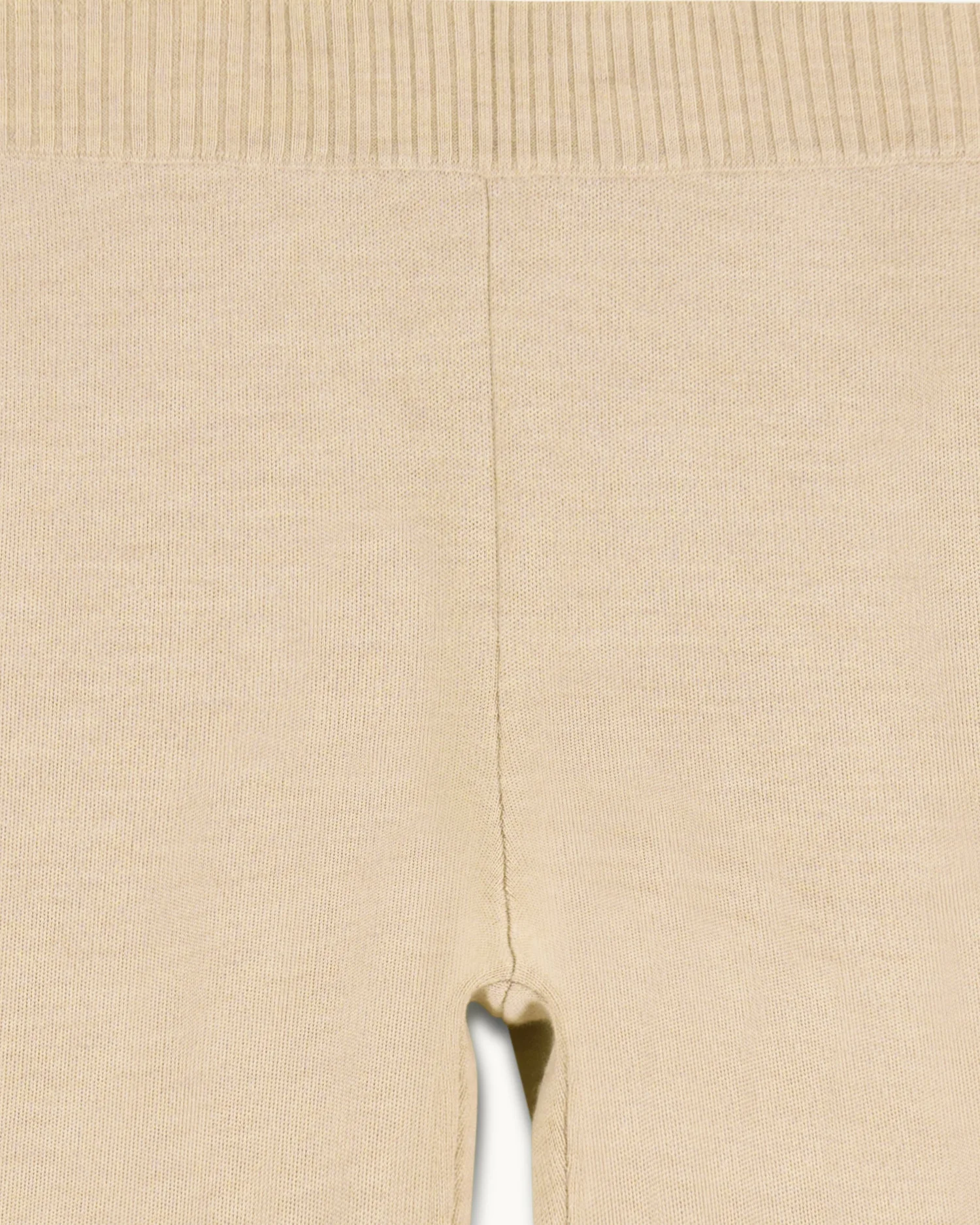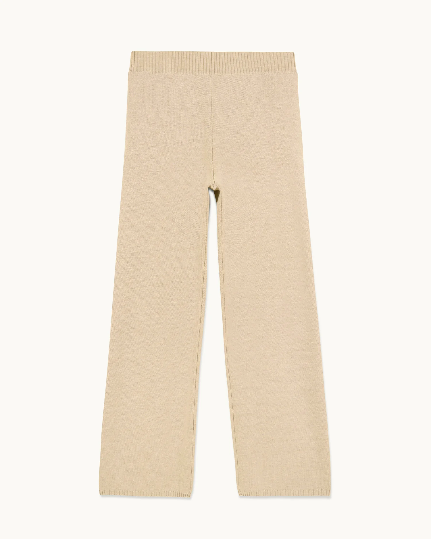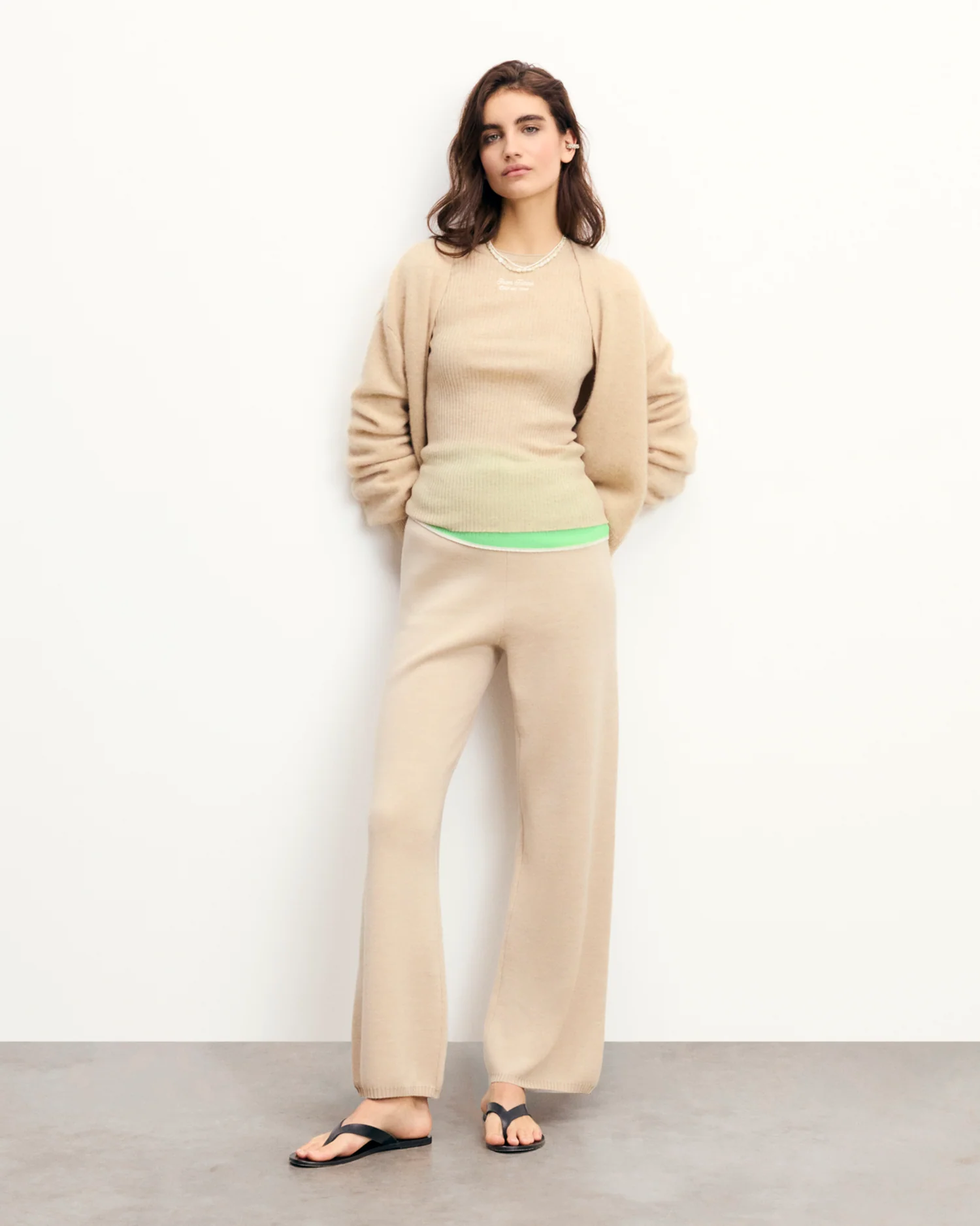 Confectionné en laine mérinos 4 fils, ce pantalon offre un tombé large, allongeant la silhouette. Muni d’une taille côtelée et de deux poches, il se porte avec le cardigan coordonné pour un ensemble décontracté.