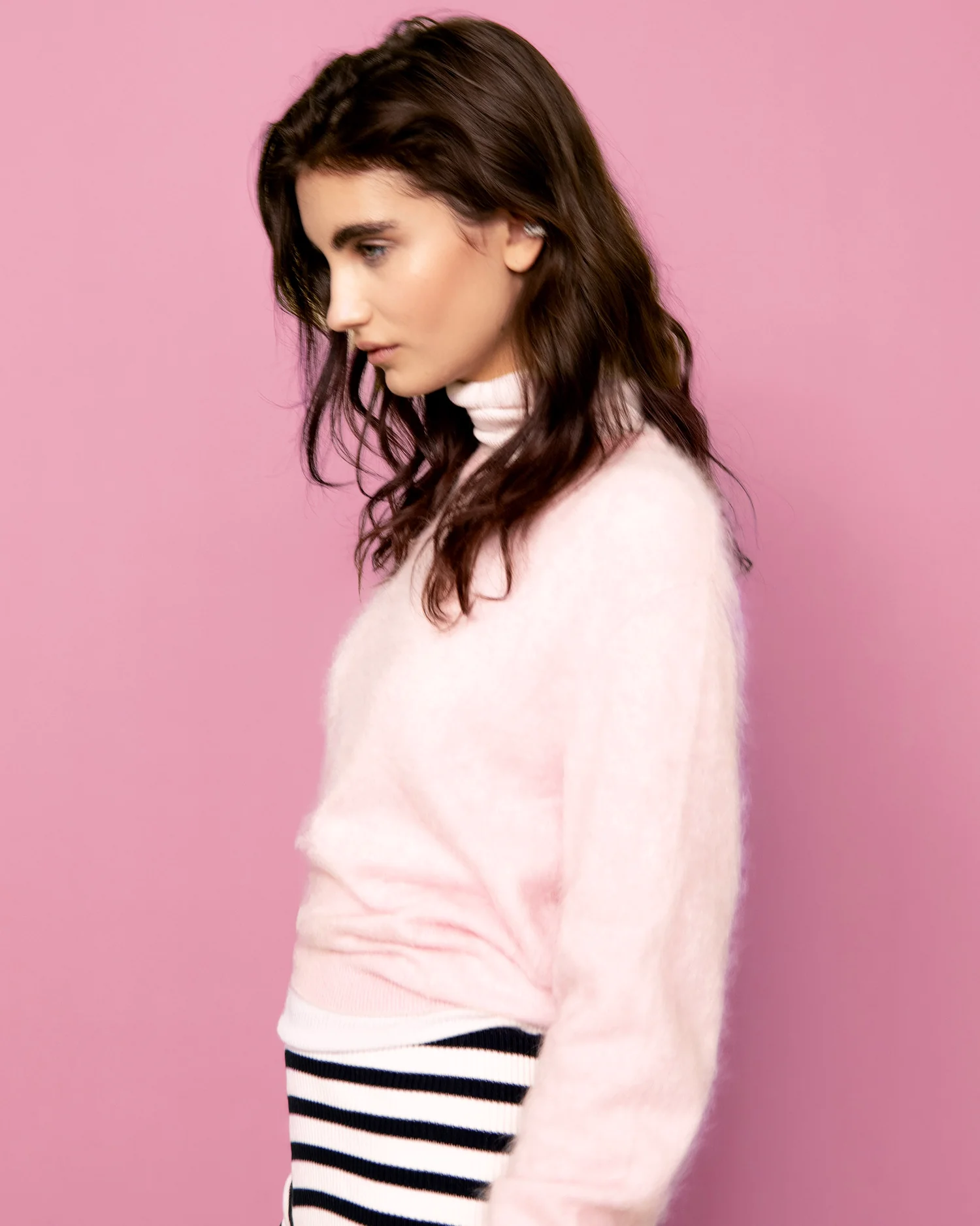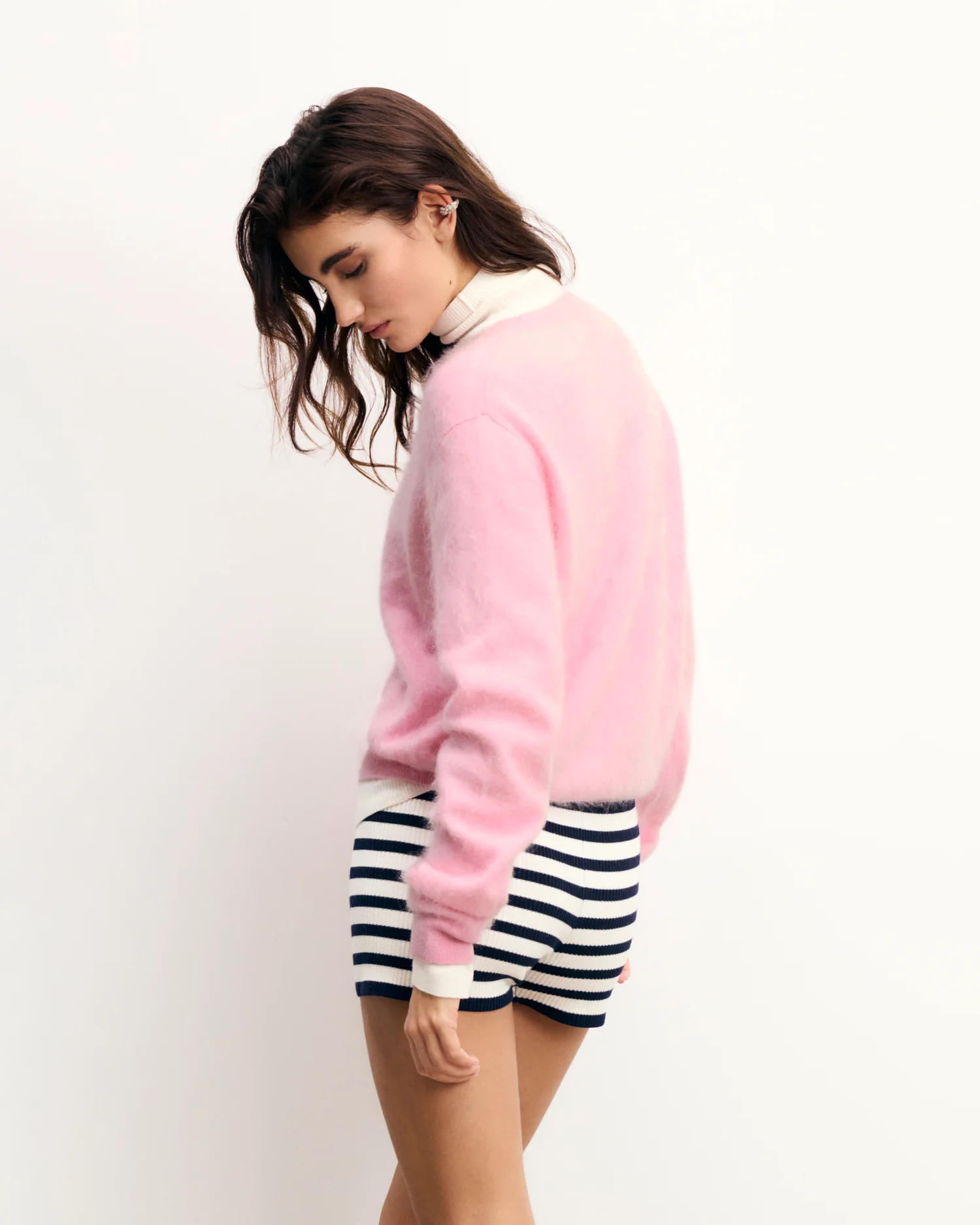 Ce pull court se distingue par une maille brossée confectionnée en cachemire 2 fils. Un col rond et des bords côtelés soulignent sa coupe ajustée. Complétez votre look avec un pantalon droit ou une robe fluide.