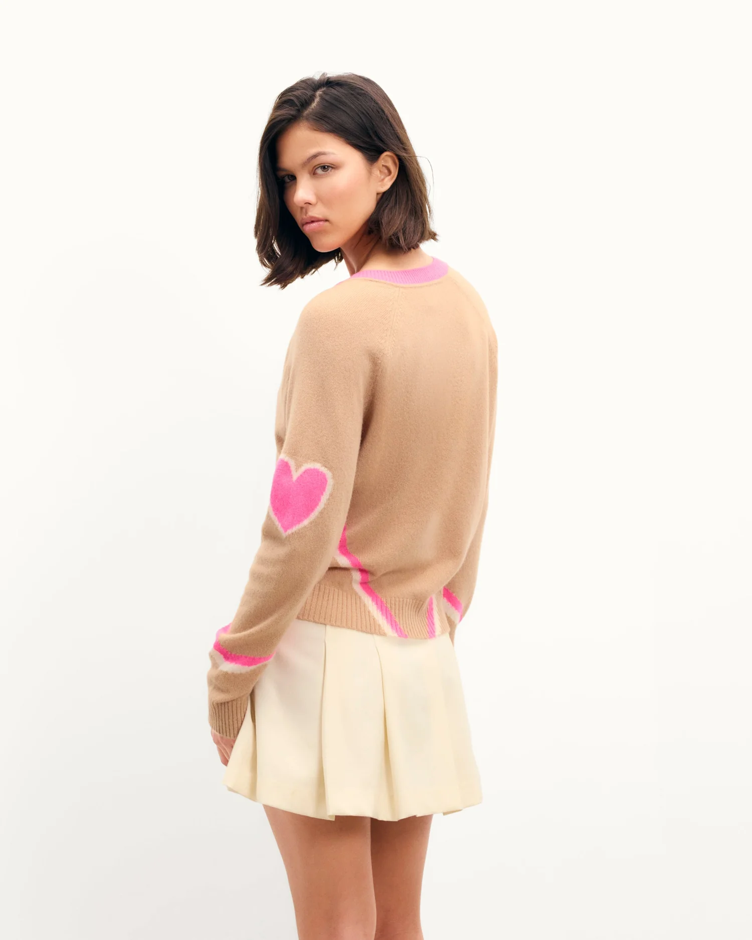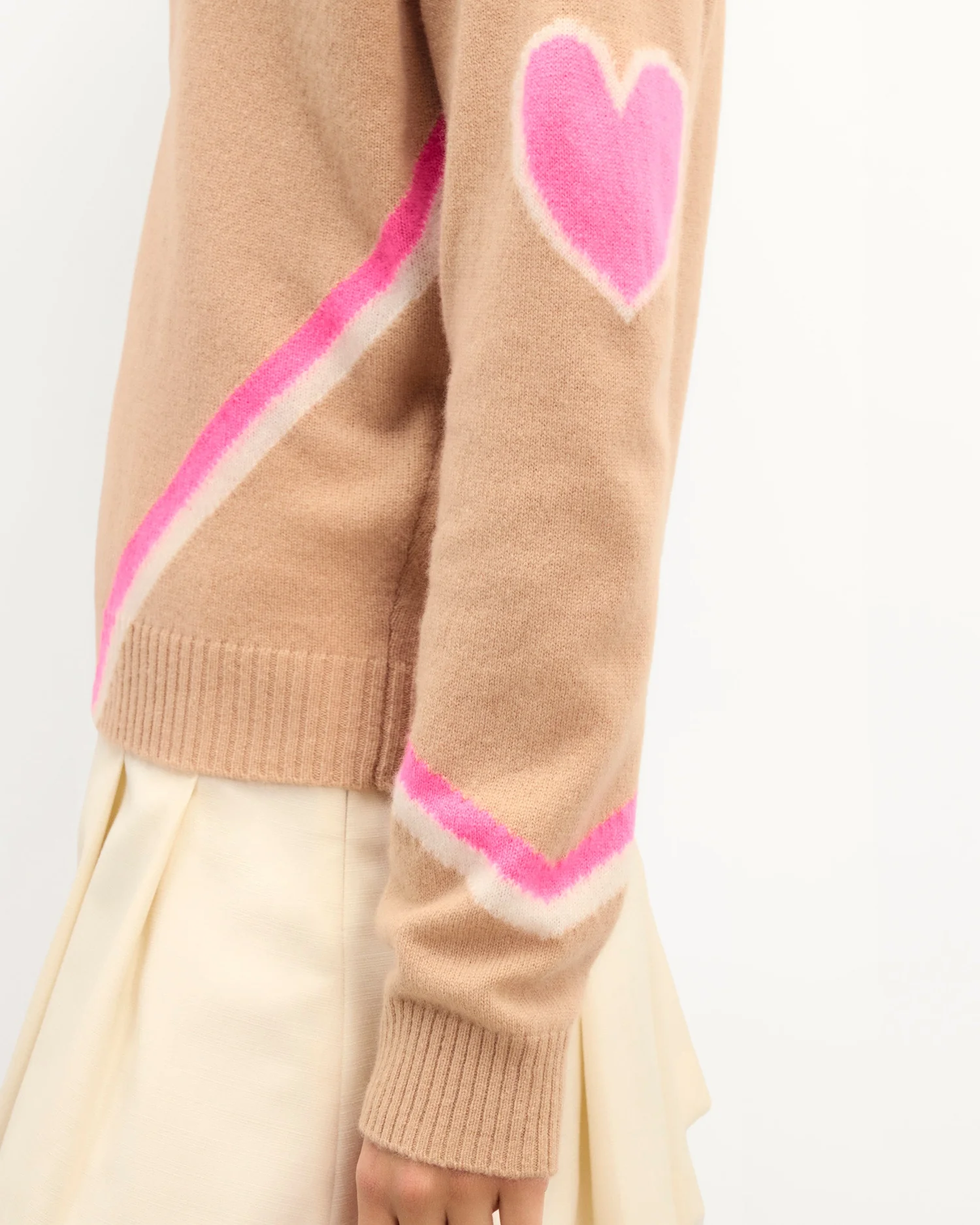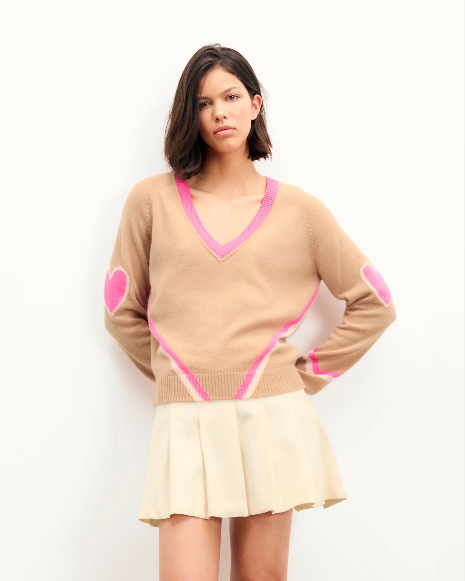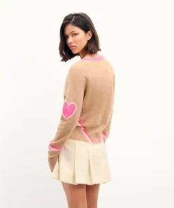Des cœurs et bandes contrastés illuminent ce pull en cachemire 4 fils. Vibrant et audacieux, il confère une silhouette structurée avec un col V, des manches longues et des bords côtelés. Idéal sur une chemise, il s’associe à un pantalon de tailleur.