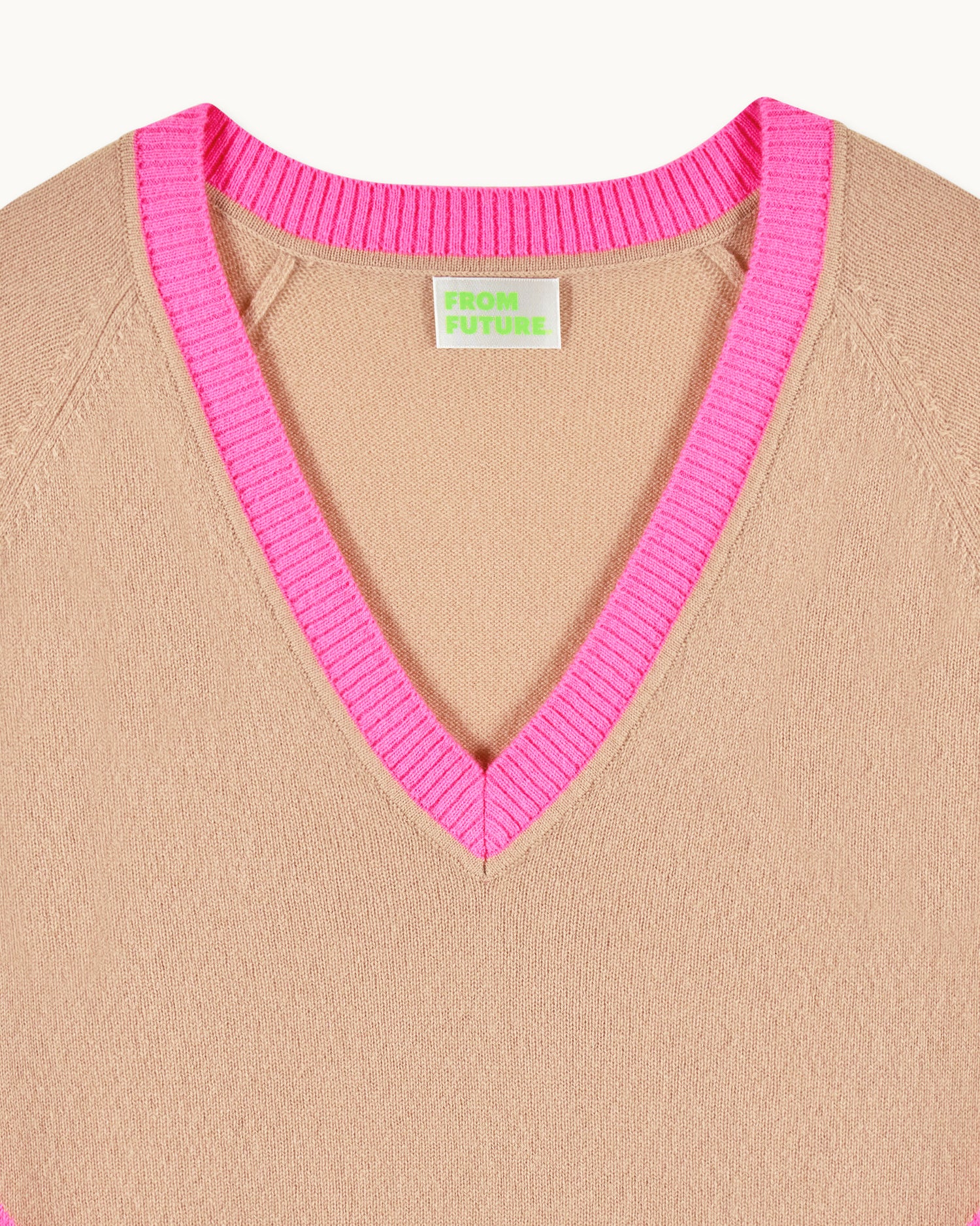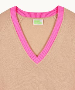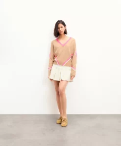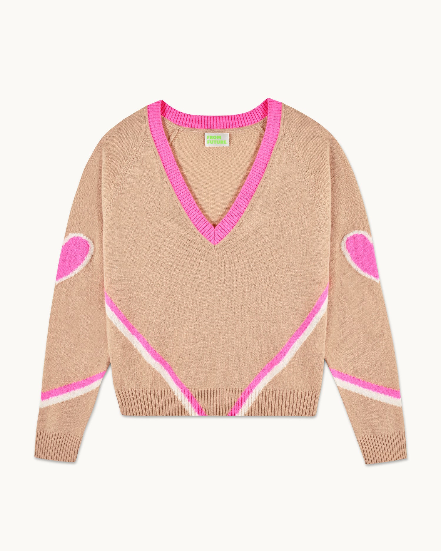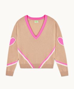 Des cœurs et bandes contrastés illuminent ce pull en cachemire 4 fils. Vibrant et audacieux, il confère une silhouette structurée avec un col V, des manches longues et des bords côtelés. Idéal sur une chemise, il s’associe à un pantalon de tailleur.
